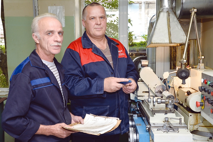 Павел Юдин обрабатывает на токарно-часовом станке сложные детали спецтехники, технологический цикл достигает порой 13 операций! Имеет личное клеймо. Владимир Власов – шлифовщик, на своём шлифовальном станке доводит детали до нужного размера.