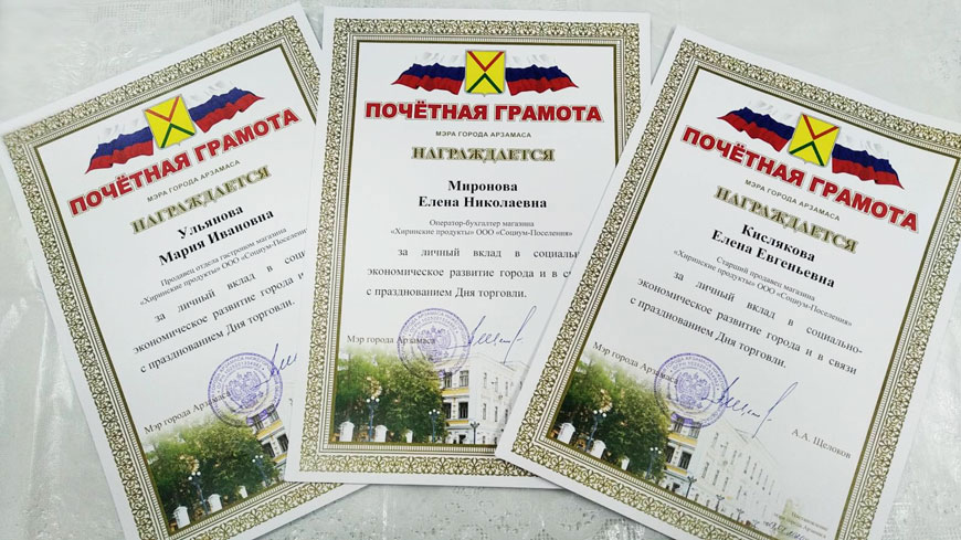 Грамоты ко Дню торговли – это дань уважения и благодарности от администрации Арзамаса коллективу, который интенсивно работал в период самоизоляции, помогая в реализации городских социальных программ. Магазин «СОЦИУМ-ПОСЕЛЕНИЙ» быстро организовал безопасную бесплатную доставку товаров на дом. Именно «Хиринским продуктам» город доверил комплектацию продуктовых наборов для социально незащищённых жителей.