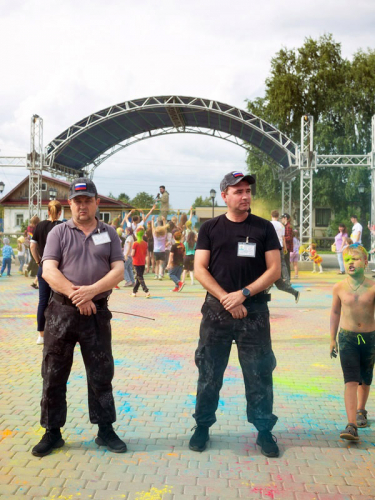 Сотрудники частной охранной организации, не теряя бдительности, сами получают удовольствие от такого яркого зрелища: много красок, радости, положительной энергии. Серьёзные лица при этом, конечно, сохраняют. Работа такая – быть сосредоточенными, на пике внутренней ответственности, пока другие беззаботно предаются развлечениям. Но на странице компании в ВК позже они оставили отзыв: «Приятно быть частью таких классных мероприятий!» и очень яркие фотографии.