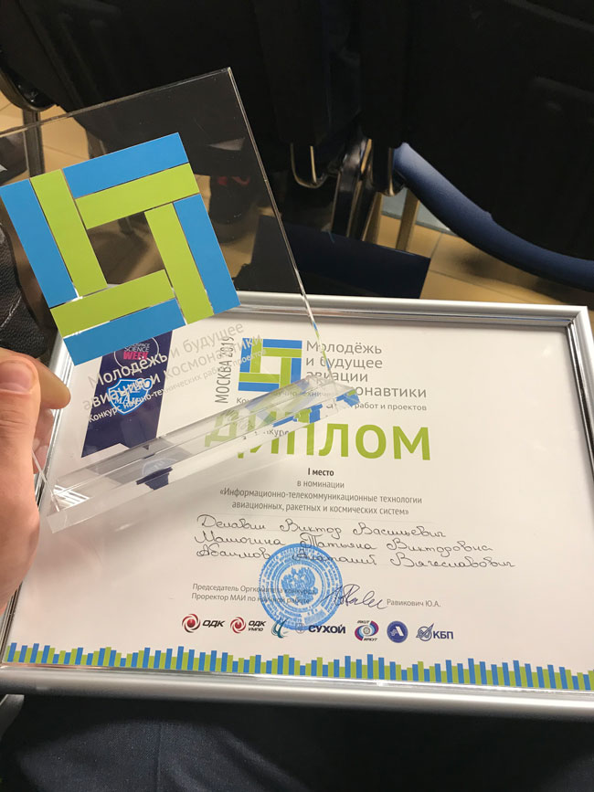 Представленная разработка была отмечена дипломом первой степени в секции «Информационно-телекоммуникационные технологии авиационных, ракетных и космических систем». Победителей конкурса награждал проректор по научной работе МАИ Равикович Юрий Александрович.