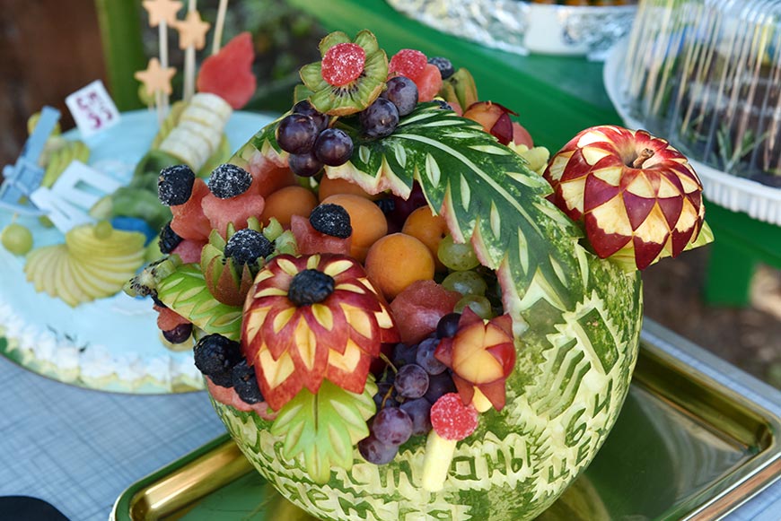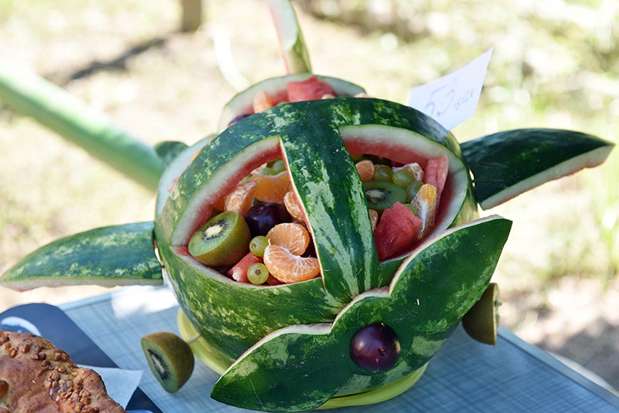 – Наш «арбуз-самолёт» весит 8 кг, – делится секретами Людмила Юлина, команда «Самолёты» (цех №53). – Идея сделать именно самолёт появилась вместе с вариантом названия нашей команды. Начинили фруктами, всё-таки лето.