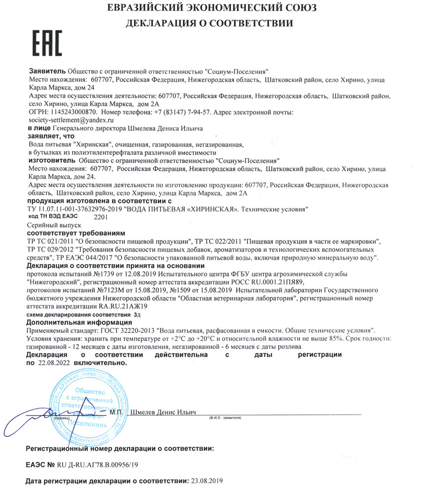 Поставки воды, которая в августе получила Декларацию о соответствии Евразийского экономического союза, уже ведутся. Вода из Хирина продаётся в магазине «Хиринские продукты» в Арзамасе.