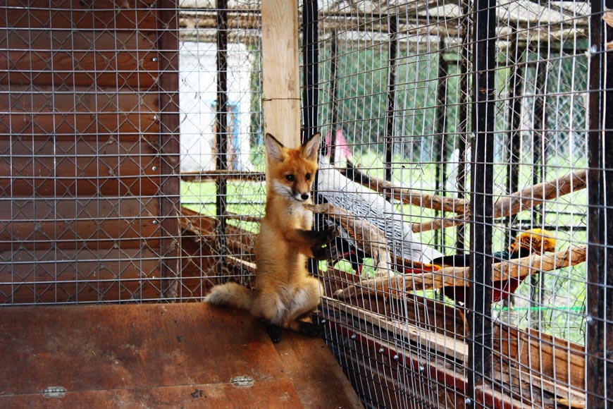 Малышкам около двух месяцев, но уже сейчас можно заметить, насколько они разные по характеру. Лиса пока боится выходить из своего домика, в то время как Тяпа с удовольствием знакомится с гостями, интересуется жизнью других обитателей зоопарка, заглядывая в клетку к фазану, и позирует перед камерами.