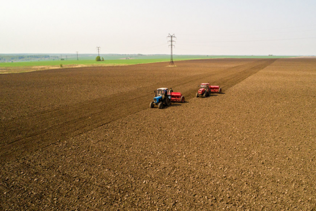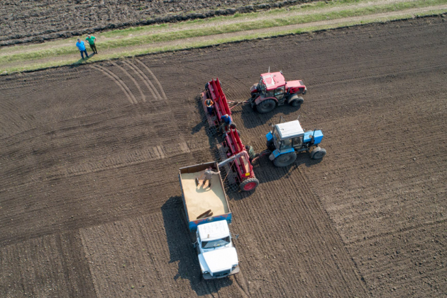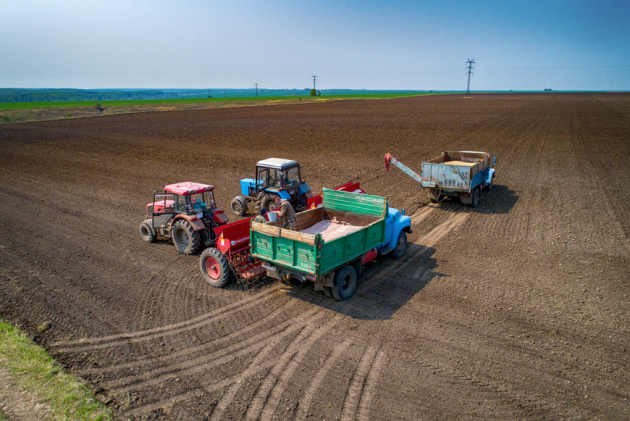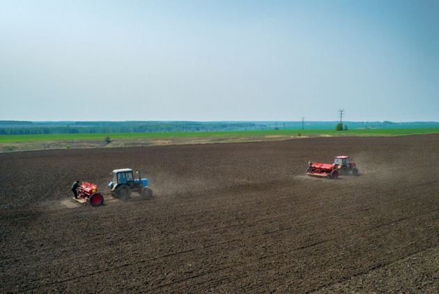 Одна машина с зерном, другая с удобрением. Почву удобряют сразу в процессе сева