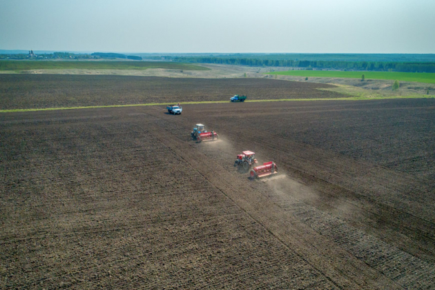 Засеяли пшеницей, ячменём, кукурузой 1574 гектара. Яровые уже дали первые нежные всходы. Поля под озимыми сверху кажутся почти синими. Это «море» – около 600 гектаров пшеницы и тритикале. Жёлтые поля – пары, земля, которую оставили отдыхать на этот сезон. Осенью её засеют озимыми.