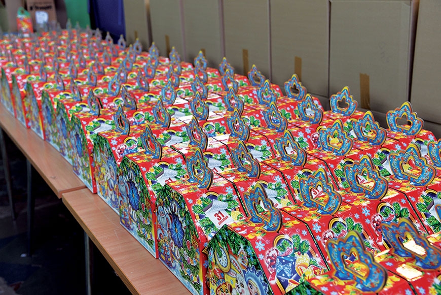Всего будет сформировано 3940 подарков. В составе каждой упаковки около 50 конфет, шоколадка, печенье, шоколадное яйцо с сюрпризом. Все сладости российского производства.