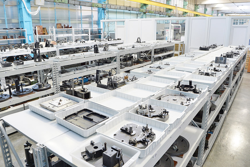 Склад от основного участка станков с ЧПУ отделяет пластиковая перегородка с дверьми и воротами для вывоза габаритной оснастки кран-балкой. Установлено 43 новых стеллажа двух видов.