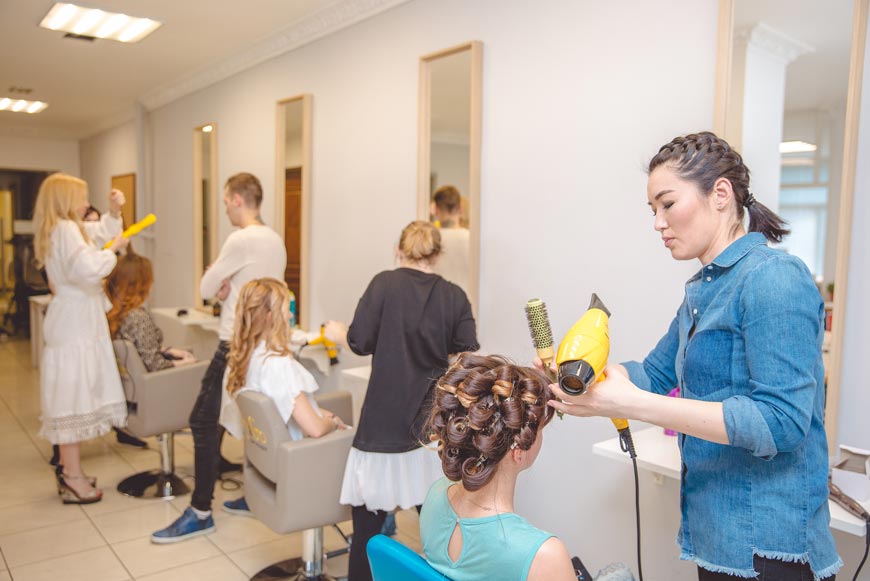 - Укладка для девушек и женщин любого возраста на любую длину волос, в том числе повседневные укладки, причёски для выпускных вечеров, свадеб и других торжественных случаев (всего около 25 видов укладок);