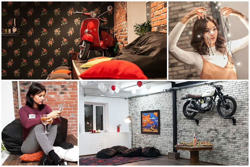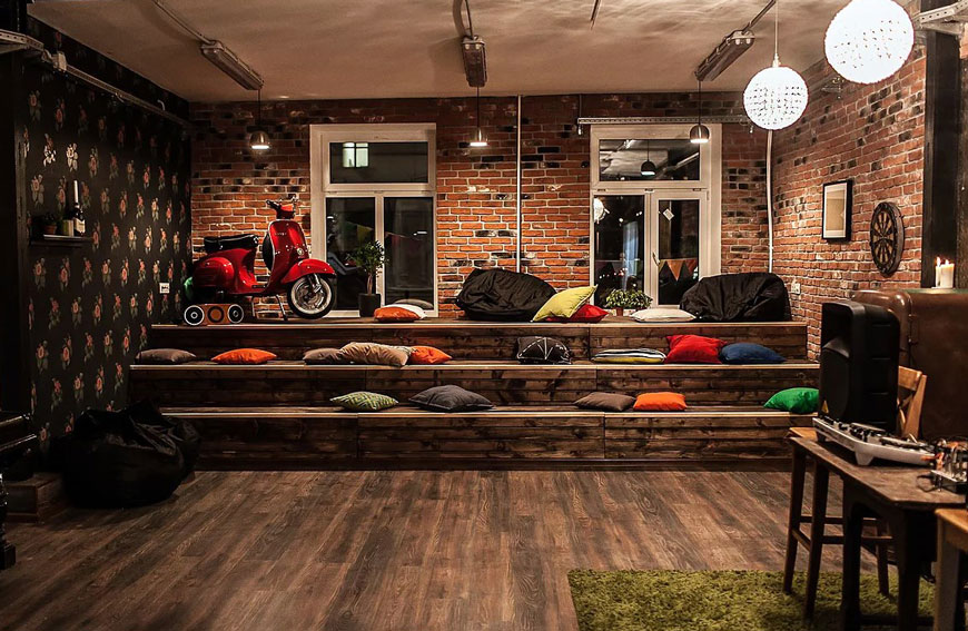 Лофт зонирован на несколько помещений. Одно из них специально приспособлено для проведения небольших конференций и тренингов, в другом даже можно проводить концерты на небольшой сцене, там есть и импровизированный зрительный зал с местами, расположенными амфитеатром. Кроме того, в лофте оборудована удобная кухня, где под рукой всё необходимое для организации фуршетов и застолий.