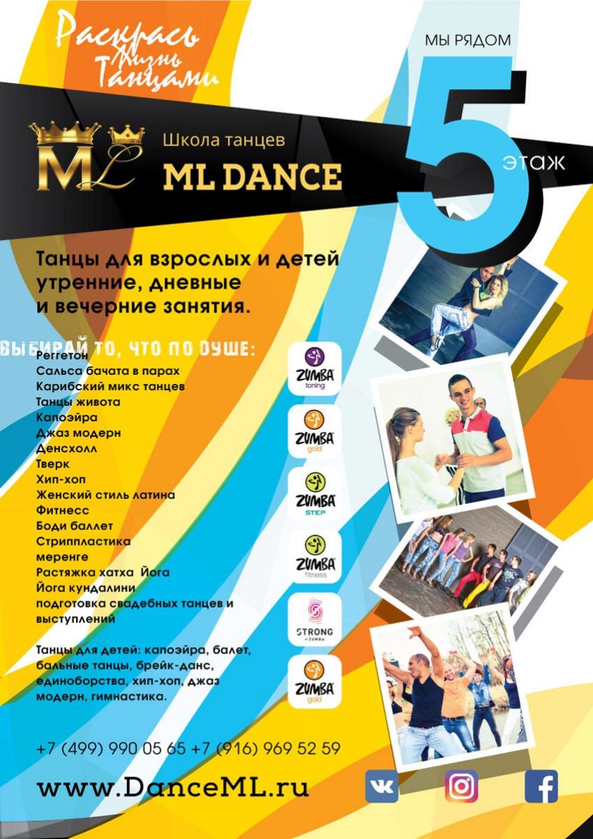 Занятия в школе ML Dance проводятся по различным танцевальным направлениям – аргентинское танго, зумба, сальса, бачата, реггетон, боди балет, меренга, бальные танцы и так далее. Также работают группы по хатха-йоге и йоге кундалини.