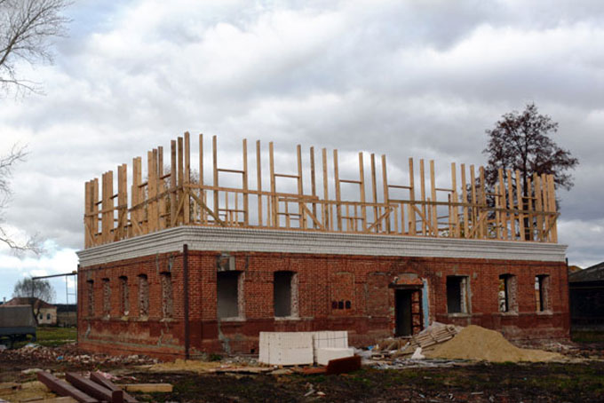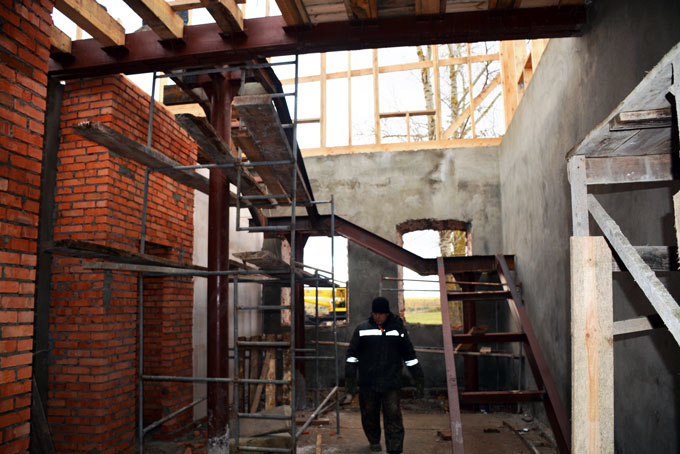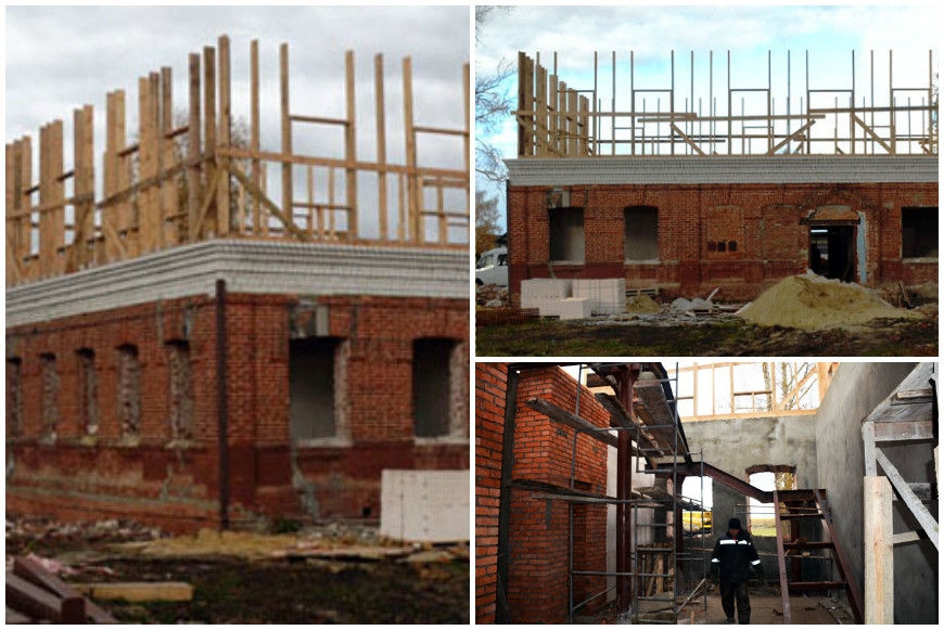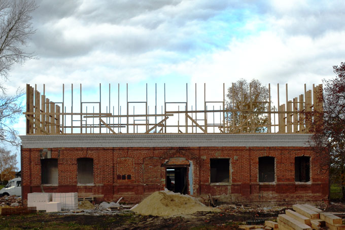 Чтобы начать реконструкцию, старую школу пришлось почти полностью разобрать. На сегодняшний день укреплены фундамент и стены будущего общественного центра, на первом этаже выложен кирпичом парапет, сделан черновой пол, положены перекрытия. До конца года планируется поставить окна и крышу и приступить к внутренним отделочным работам. То есть в следующем году строительство уже будет завершено.