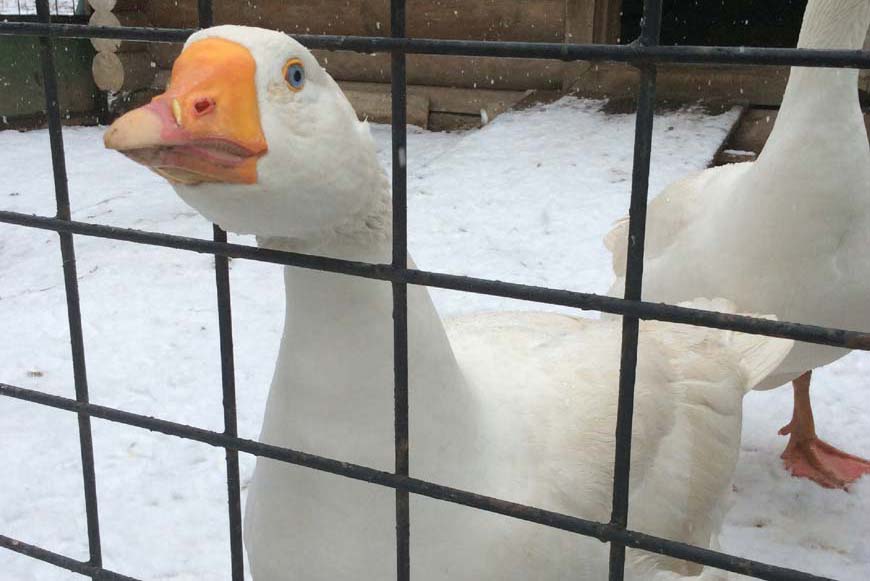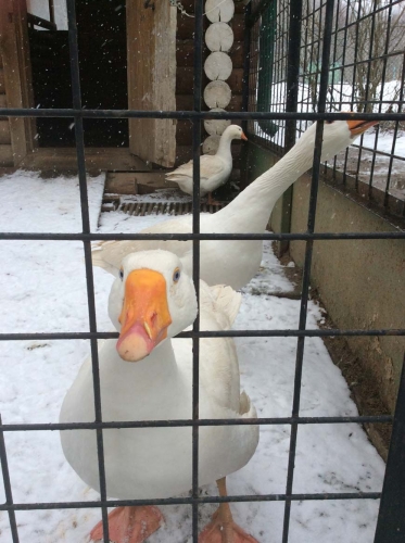 Гуси не дают прохода посетителям и требуют к себе особого внимания. Просовывая головы через сетку, так и норовят ущипнуть проходящих мимо.