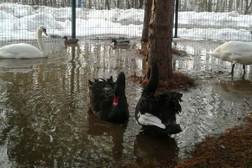 Заметно оживился пруд. Зимой здесь было тихо, но теперь водоплавающие (лебеди, гуси, утки) крякают, гогочут, свистят во все голоса. А парочка чёрных австралийских лебедей не прочь пообщаться с гостями.