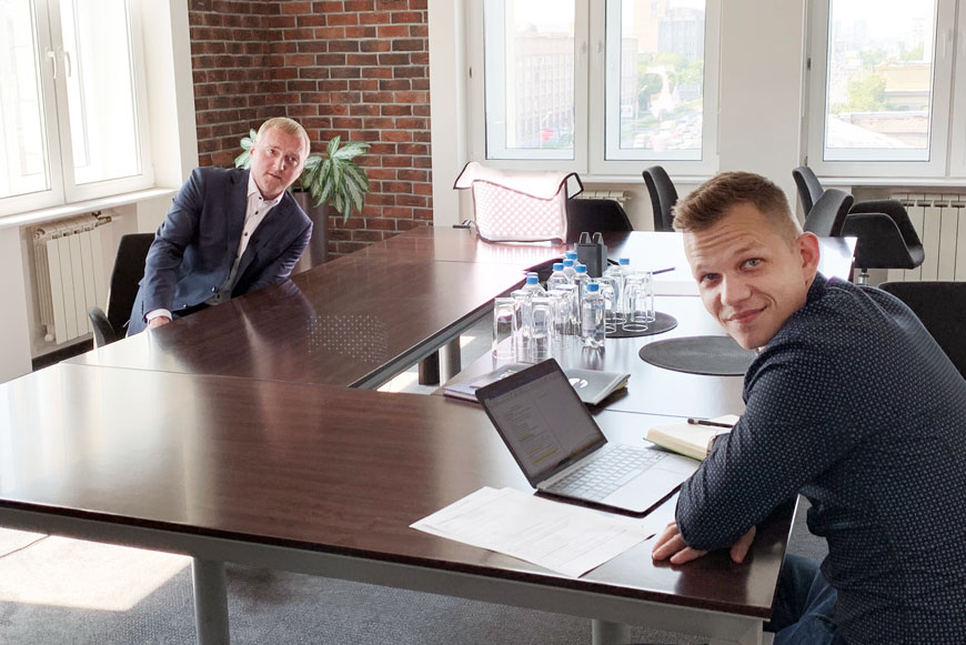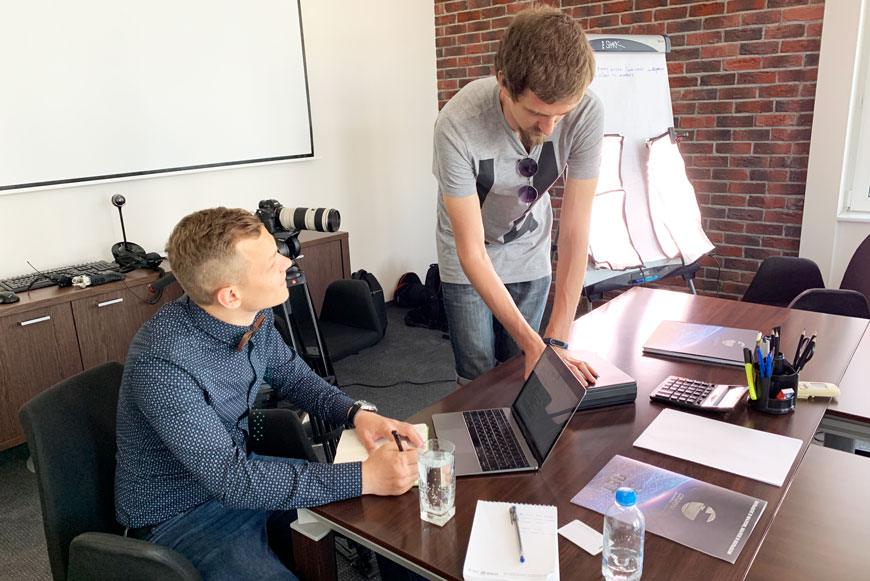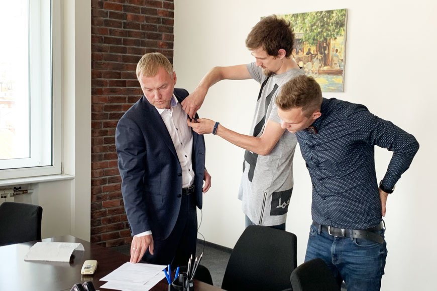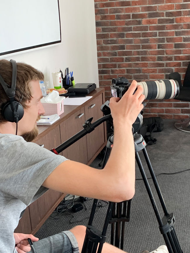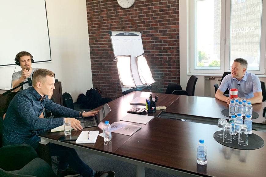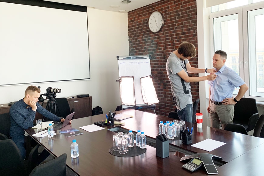 Всё началось утром. Елена Мясникова и Юлия Мальцева встретили съёмочную группу на ресепшен и проводили ребят в малую переговорную, где развернулась импровизированная студия.