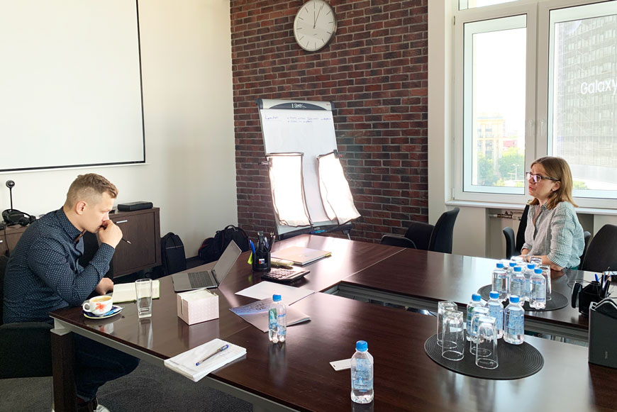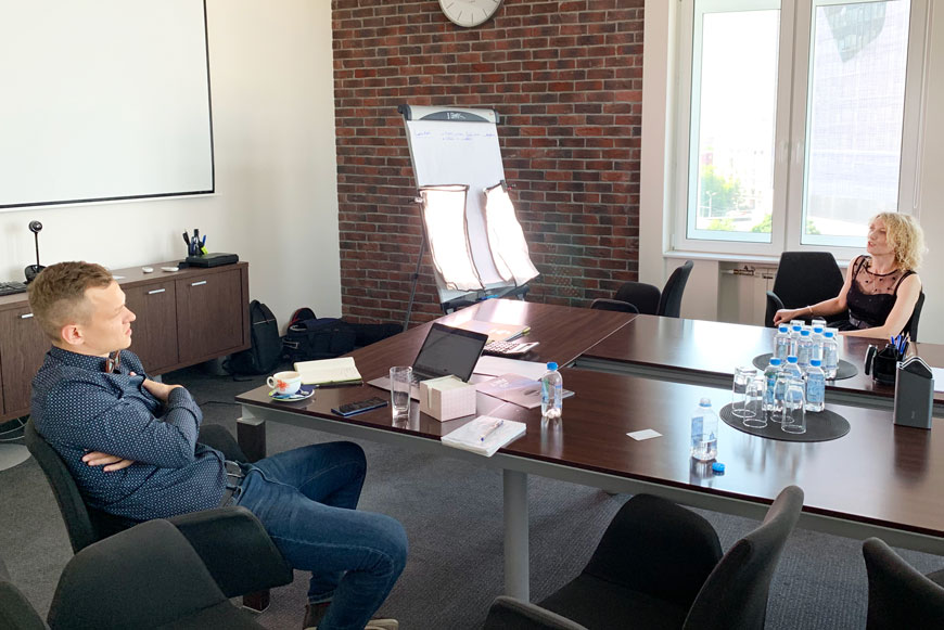 Затем настала очередь Натальи Волчковой и Ирины Никифоровой. Пока Ирина Владимировна рассказывала о сотрудниках «СОЦИУМА» как о высоких профессионалах, использующих свои навыки и компетенции для роста производительности труда и увеличения прибыли компаний, Андрей Данько включился в режиссёрский процесс.
