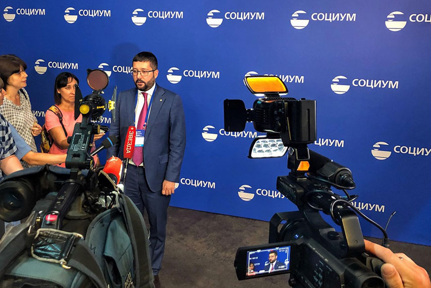 Живое интервью на камеру даёт генеральный директор «СОЦИУМА» Руслан Ашурбейли. Операторов много, но слушателей и зрителей гораздо больше!
