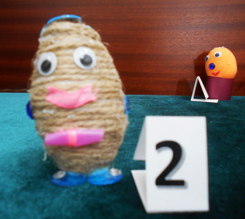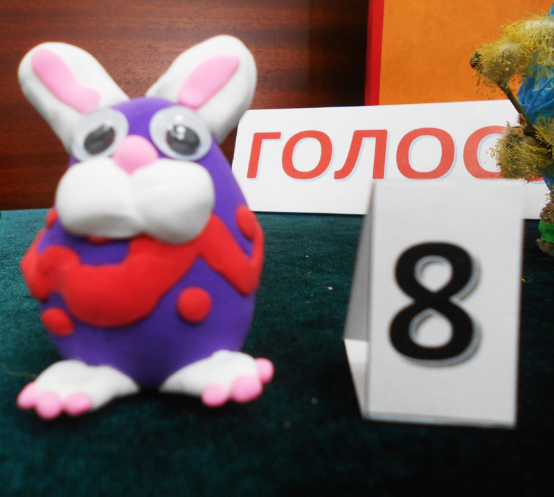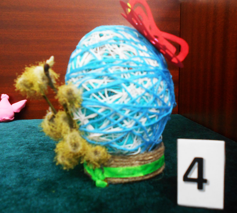 Очень понравились участникам голосования яйцо из ниток, созданное техническим работником Общественного центра Екатериной Козловой (№ 4), и № 7 – первая работа из пластилина от пятилетней Танечки. Таню в Общественном центре учат работать с разными материалами для творчества, с которыми она раньше была не знакома. Она сейчас с удовольствием рисует и лепит, хотя ещё недавно совсем этого не умела.
