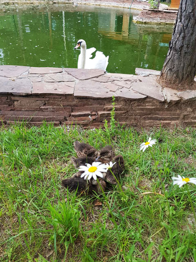 6 пушистых маленьких утят и 3 гусёнка появились на свет в зоопарке пансионата «Морозовский» и уже стали всеобщими любимцами. Подвижные, непослушные, неуклюжие, они так похожи на наших детей! Бегают за бабочками и мухами, купаются в лебяжьем озере, греются на солнышке, норовят сбежать от мамы-утки…