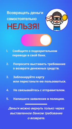 Не переводите деньги обратно на указанные счета. Возможно, это часть мошеннической схемы, и есть риск стать соучастником незаконных операций. Деньги можно будет вернуть только через выставленное банком требование о возврате.