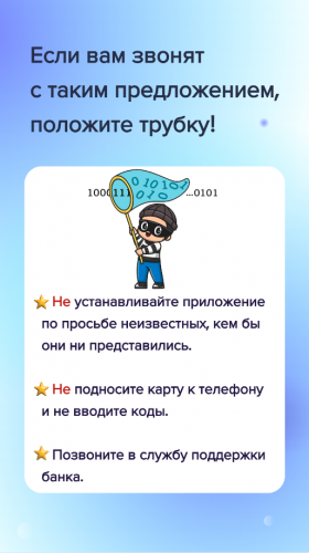 - Не устанавливайте приложение по просьбе неизвестных лиц, даже если звонящий представляется сотрудником банка.