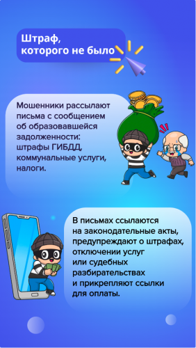 Мошенники рассылают якобы официальные письма с сообщением об образовавшейся задолженности: штрафы ГИБДД, неоплаченные коммунальные услуги, налоги, вымышленные долги. В письмах ссылаются на законодательные акты, чтобы придать сообщению официальный вид, и прикрепляют ссылки для оплаты.