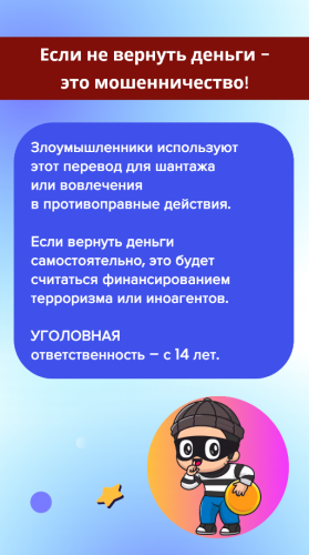 Осуществив перевод на карту жертвы, злоумышленники затем используют этот факт для шантажа или вовлечения в противоправные действия.