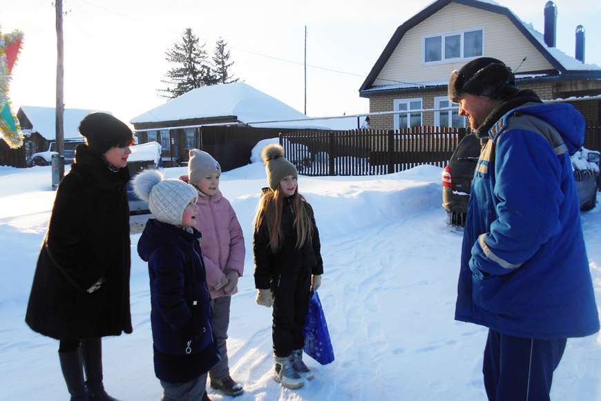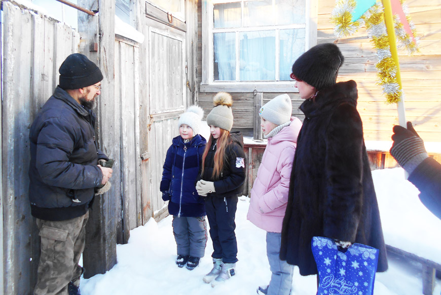 На следующий день ученики Общественного центра отправились колядовать по селу. Пели и декламировали колядки, которые специально учили к этому празднику. По старинным русским поверьям, колядки приносят в дом добро и удачу, поэтому односельчане тепло встречали ребят и взамен одаривали их вкусностями. Виктор Иванович Кудряшов, хиринский пасечник, наградил гостей ведёрком мёда. Вернувшись в Общественный центр, они напились чаю с конфетами и мёдом, отогрелись и разделили между собой всё «заработанное» колядками – такова традиция.