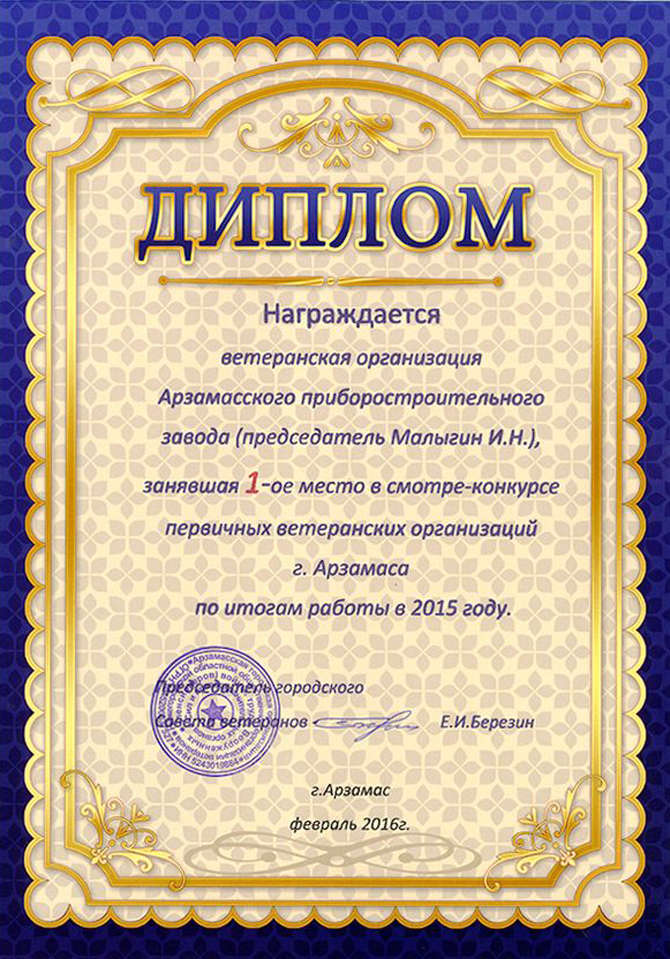 Диплом победителя был вручён председателю Совета ветеранов АО «АПЗ» Ивану Малыгину на пленуме арзамасского городского Совета ветеранов по итогам работы за прошлый год.