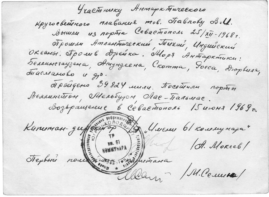 «Участнику Антарктического кругосветного плавания тов. Павлову В. И.