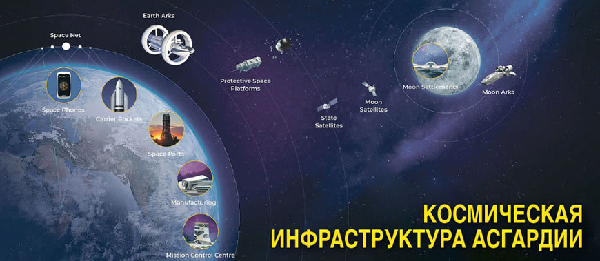 Исходя из намеченных этапов должны создаваться инфраструктурные составляющие космического государства: земная (космодромы, производство специальной техники, пункты управления), околоземная (орбитальный спутниковый рой для независимого от Земли интернета и группировка космических аппаратов, обеспечивающих все функции цифрового государства, космические ковчеги и космофлот), окололунная, лунная и звёздная.