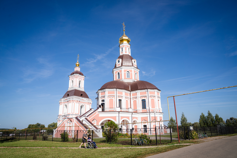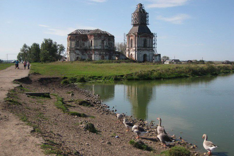 Храм в честь Усекновения Честной главы Иоанна Предтечи сияет среди сельских домиков, соединяя землю и небо, поднимаясь ввысь на 36 метров. Колокольня стоит отдельно, рядышком. Она на шесть метров ниже, но и её купол тоже смело взрезает небеса. Глядя на этот архитектурный комплекс, не верится, что ещё каких-нибудь 13 лет назад он был в руинах.