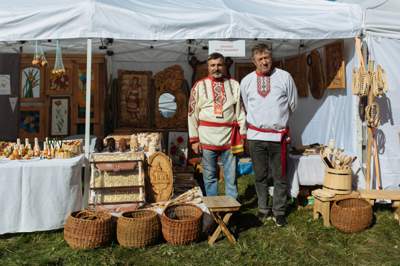 После службы на поле у храма развернулась большая ярмарка. Тут моё внимание в первую очередь привлекли ремесленники. Они предлагали интерактив, а не только возможность приобрести изделия. Более двадцати мастеров народных промыслов представляли свои работы: от керамики, ткачества и росписи по ткани до резьбы по дереву и традиционных игрушек. На мастер-классах можно было попробовать освоить технологии, которыми пользовались наши предки.
