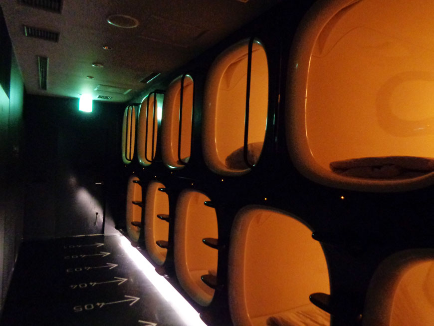 После такого насыщенного дня только и оставалось, что поесть и влезть на своё спальное место в капсульном отеле. Вид сюрреалистический, а вкупе с чёрными пижамами навевает мысли о фантастическом фильме про космическую тюрьму. Но капсулы удобные и достаточно просторные.