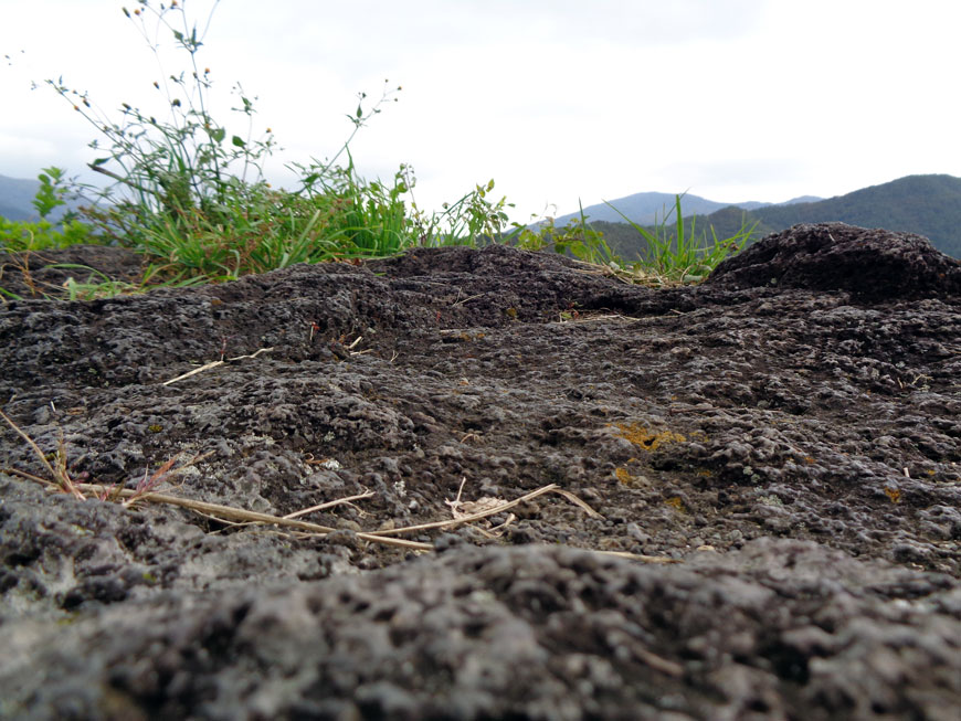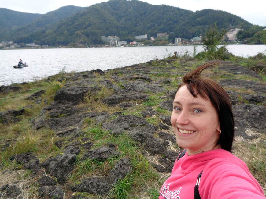 Озеро образовалось в те времена, когда Фудзи была действующим вулканом. Его берега сложены вулканическими породами. Ноздреватый чёрный камень, мох, клочки травы – инопланетный ландшафт.