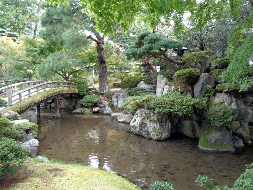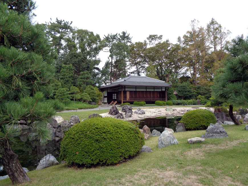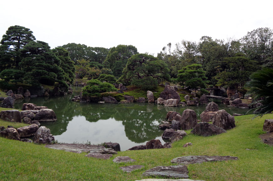 Сердце города. Как все японские дворцы, он непривычен для нас на вид и представляет собой большой комплекс просторных павильонов, соединённых галереями и окружённых прекрасным садом.