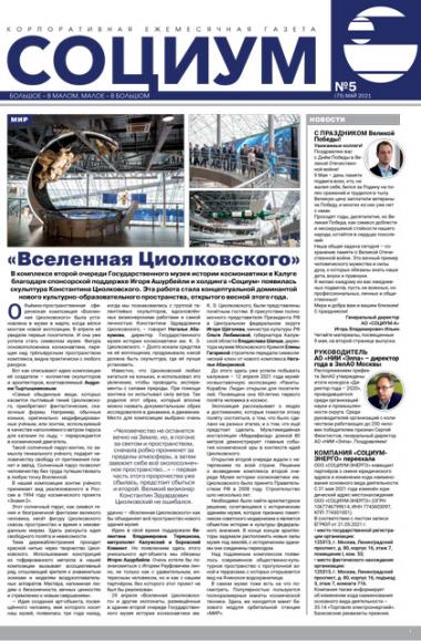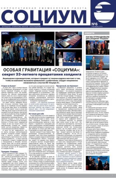 Корпоративной газеты «СОЦИУМ» будет выходить 6 выпусков в год. Корпоративная — не значит узко специализированная, для служебного пользования. Газета под названием «СОЦИУМ» такой быть не может. Корпоративная - значит коллективная, общая информационная площадка, открытая для всех и каждого сотрудника холдинга трибуна, совместно пополняемая копилка производственного, социального и житейского опыта.