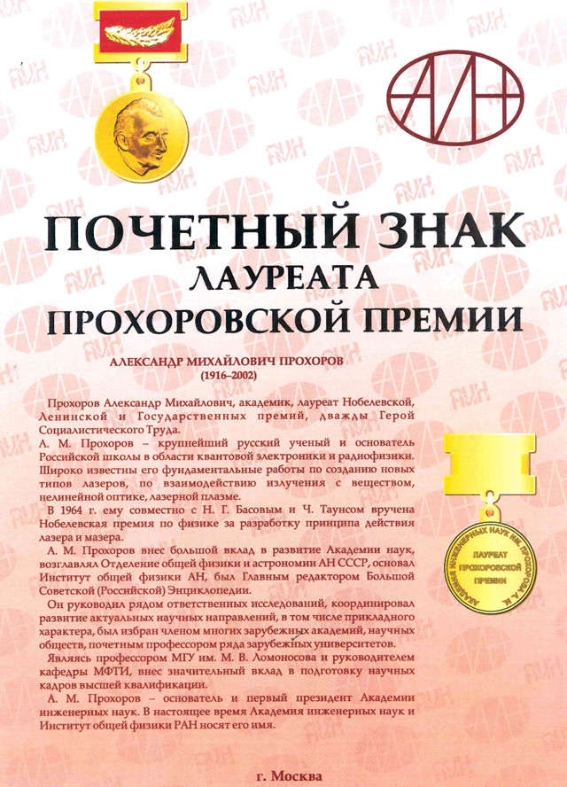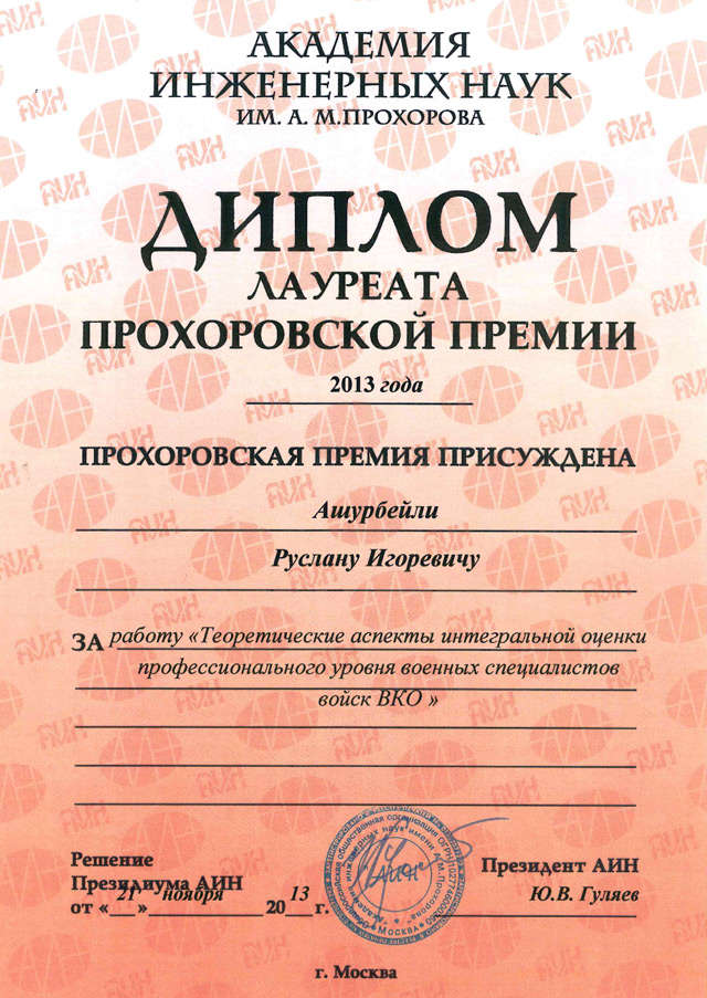 21 ноября 2013 года присуждена Прохоровская премия за работу «Теоретические аспекты интегральной оценки профессионального уровня военных специалистов войск ВКО».