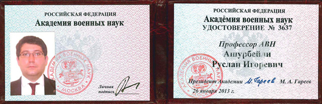 26 января 2013 года присвоено звание Профессор Академии военных наук.