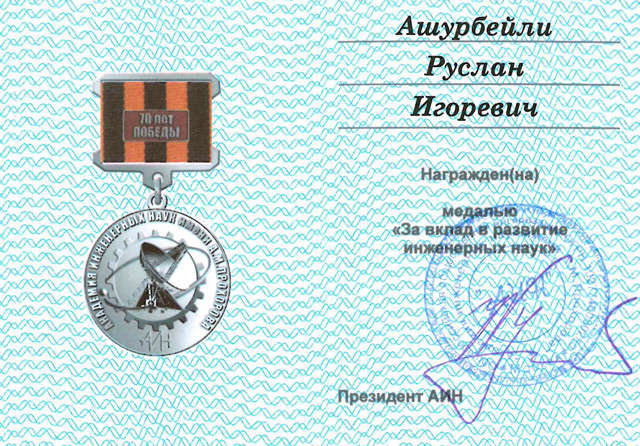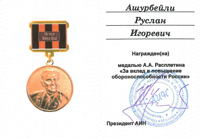 Решением Президиума Академии инженерных наук имени А. М. Прохорова (АИН) от 16 апреля 2015 года Руслан Игоревич награждён медалью А. А. Расплетина «За вклад в повышение обороноспособности России» и медалью «За вклад в развитие инженерных наук».